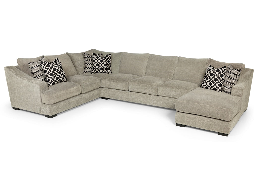 The sectional sits on low square feet stained in espresso, giving it a sleek and modern foundation. What sets the 338 apart is its feather down seat cushions, back cushions, and accent pillows, which offer the ultimate snuggling experience. Designed for those who seek both luxury and comfort, the Stanton 338 is versatile enough to fit into any home.