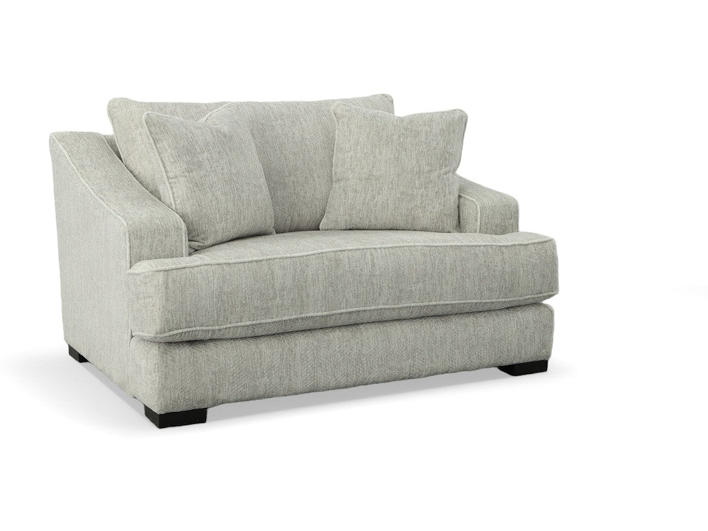 Upholstered in Zaftig Dove fabric, a soft textured light grey, the chair brings a calm, sophisticated vibe to any space. The two included accent pillows—covered in Alessio Dove fabric with a distinct texture—complement the chair's upholstery, adding texture and a touch of elegance to the design.